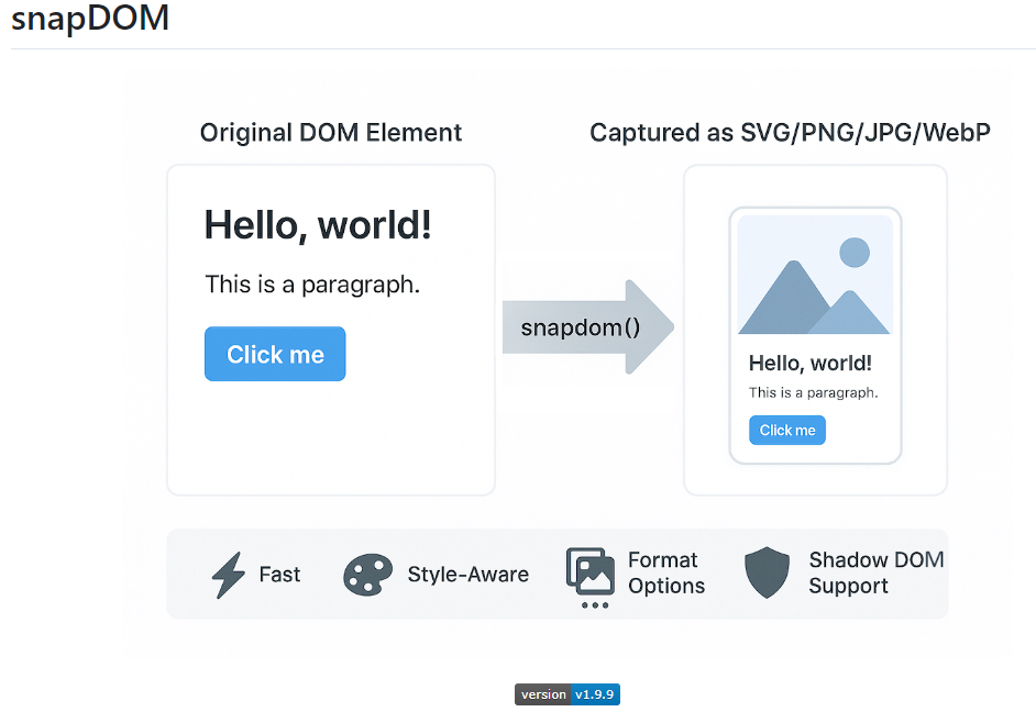 snapDOM是为Zumly(一个基于缩放的视图转换框架)构建的快速、准确的dom到图像捕获工具。它将任何HTML元素捕获为可伸缩的SVG图像,保留样式、字体、背景图像、伪元素,甚至影子DOM。它还支持导出到光栅图像格式和画布。