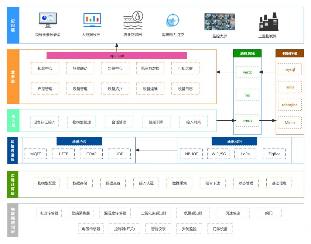 - 系统后端采用Spring boot;前端采用Vue3+Element Plus;消息服务器采用EMQX5.0;数据库采用Mysql、TDengine和Redis;设备端支持OpenWrt,FreeRTOS,RT-Thread等操作系统的接入sdk;